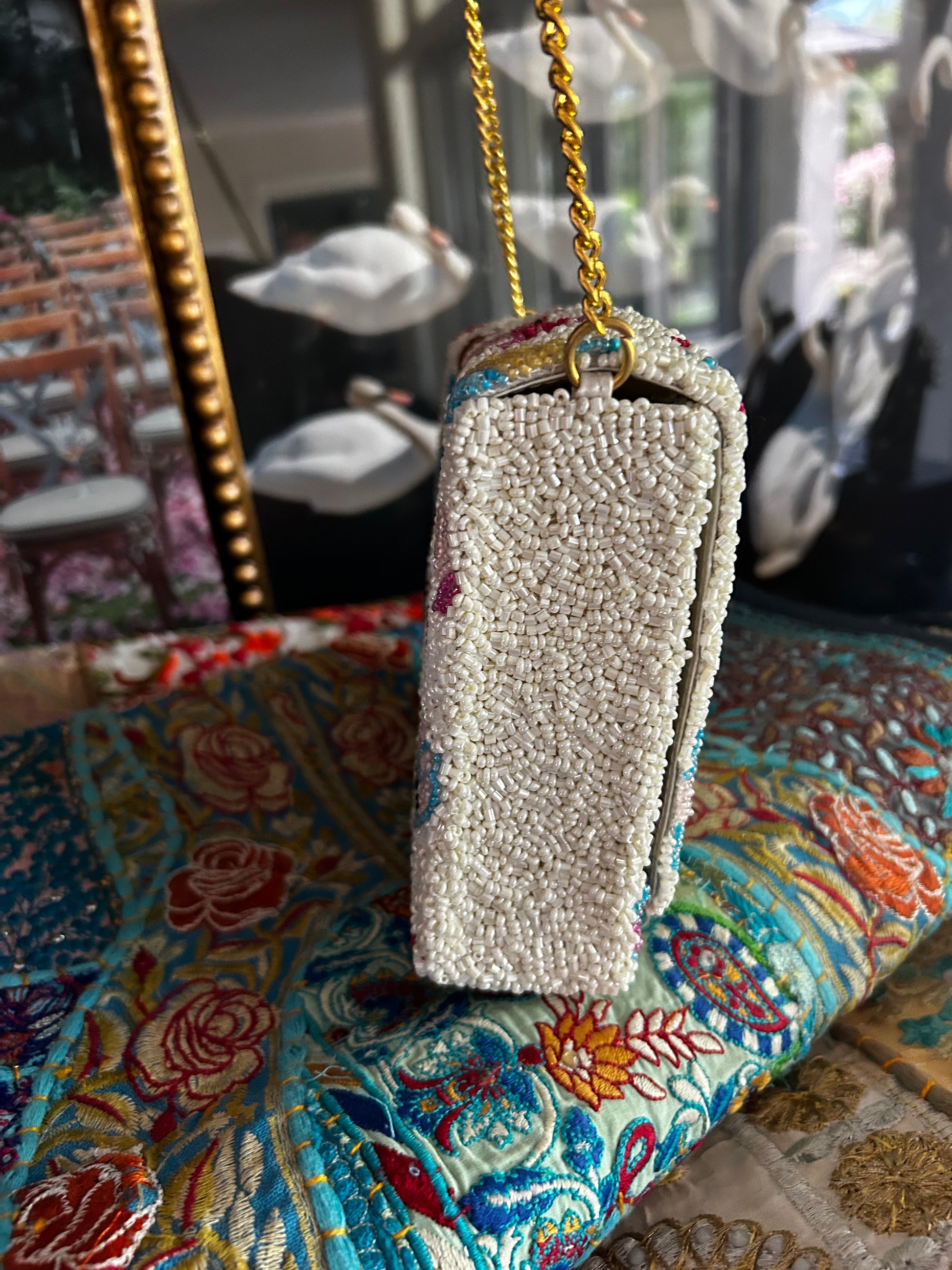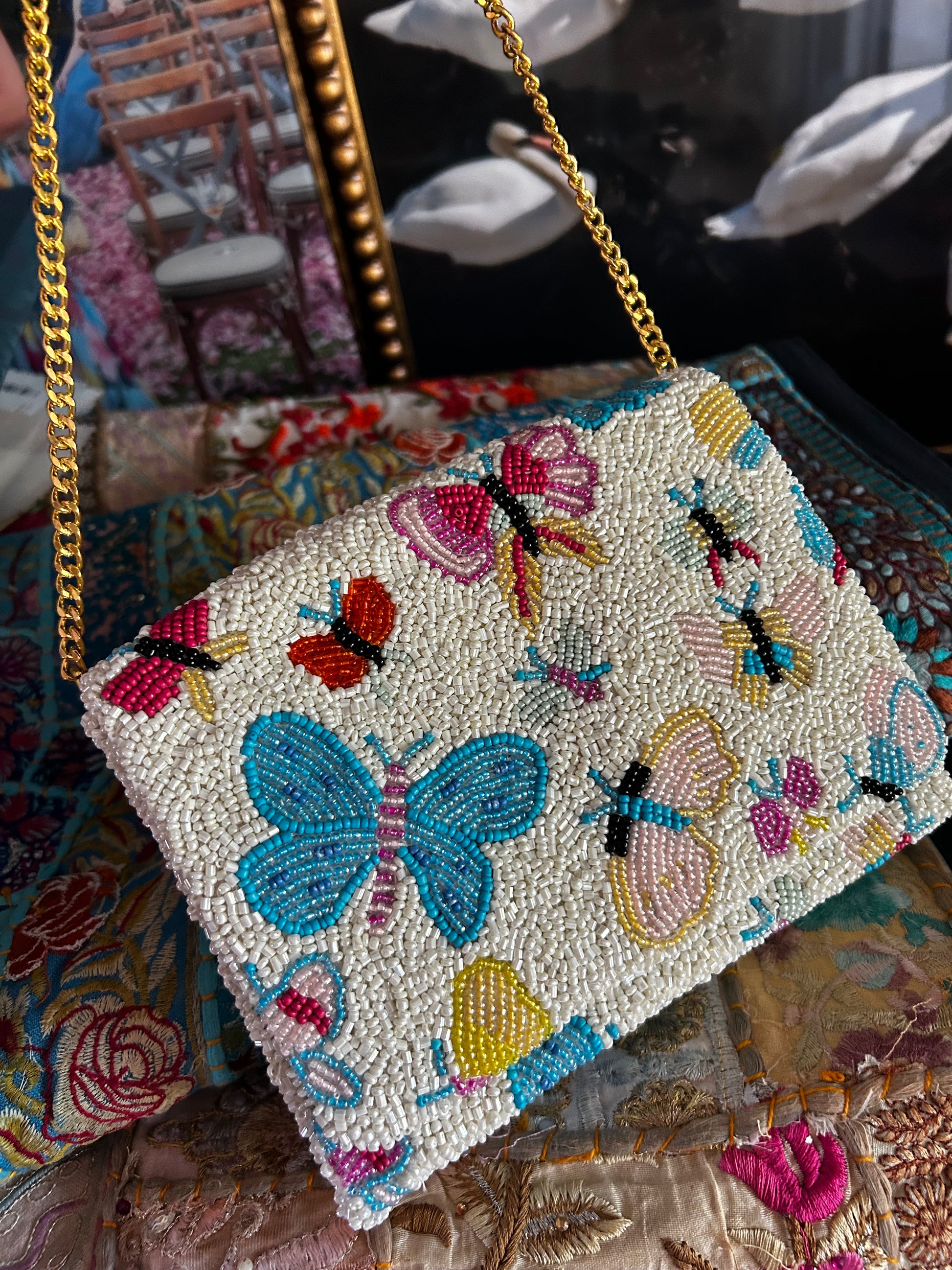 Description: Transform your look with Aunt K's Butterfly Bliss Bag, an enchanting accessory that celebrates the beauty and symbolism of butterflies. This exquisite bag is adorned with a dazzling array of hand-beaded butterflies in a rainbow of colors, set against a pristine white background. An elegant gold chain adds a touch of sophistication, making it perfect for both day and night adventures.
